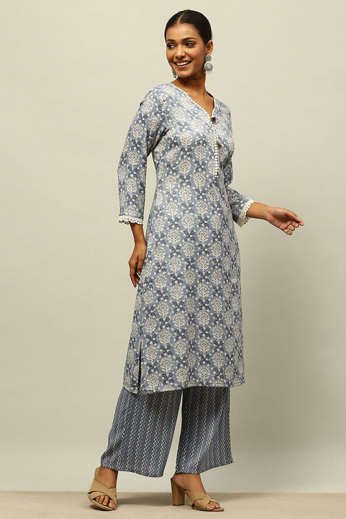 Grey Viscose Blend Straight Printed Kurta Palazzo Suit Set