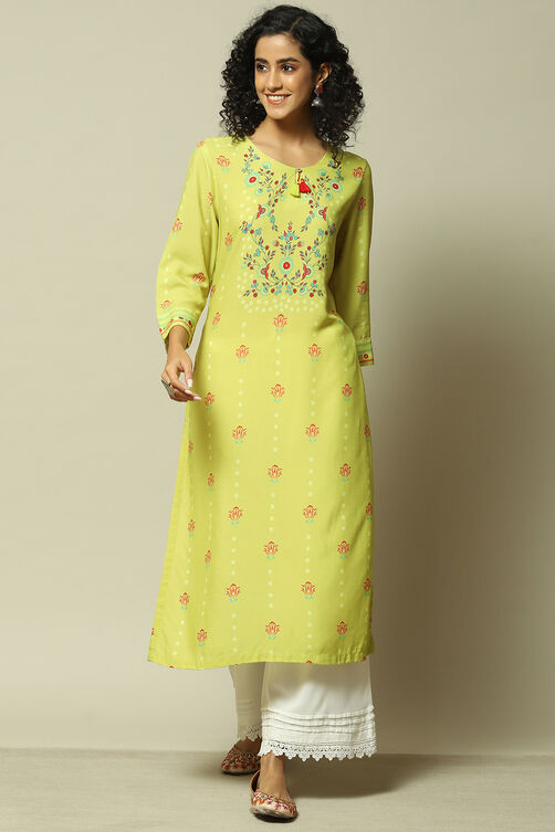 Embrace the vibrancy of casual wear with our lime yellow straight kurta, meticulously crafted from 100% viscose (LIVA) for lasting comfort. This kurta boasts a charming round neck adorned with tasteful tassels, alongside a cheerful multicolor floral print that adds a splash of color and playfulness to any ensemble. Its 3/4 sleeves offer a breezy, comfortable fit, making it a splendid choice for women looking to brighten their wardrobe. Accentuate this kurta with minimalist gold jewellery and a beige tote for a beautifully coordinated, sunny day look.