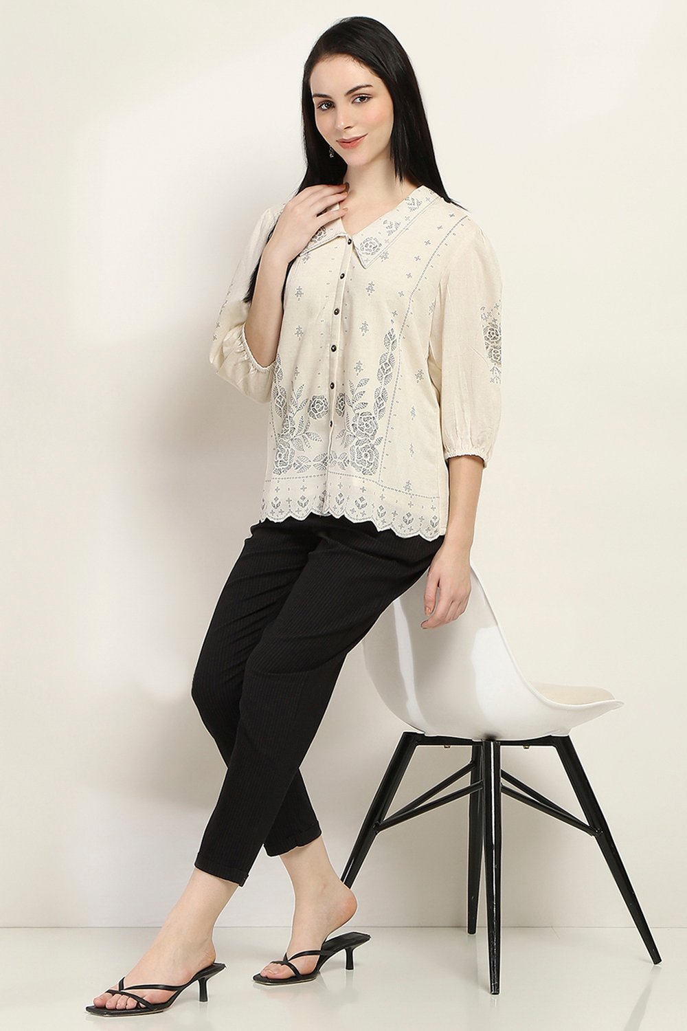Pair this indie-inspired shirt with sleek black pants for a smart yet easygoing ensemble. Finish with open-toe flats and crisp white earrings for an effortlessly chic vibe that’s perfect for sunlit afternoons and stylish summer moments.