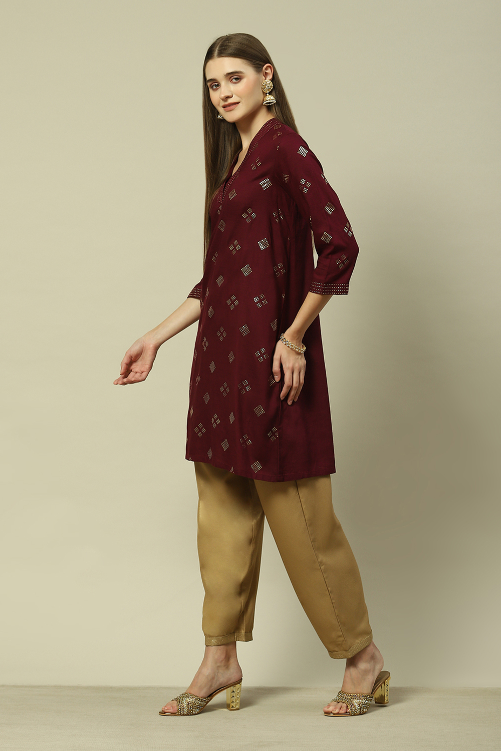 This elegant purple straight kurta, crafted from the luxurious and eco-friendly viscose fabric by LIVA, is perfect for festive occasions. Featuring a flattering V-neck and adorned with all-over silver foil prints, it adds a touch of glamour and sophistication to your festive attire. The 3/4 sleeves ensure a comfortable fit, making it ideal for celebrations. Pair this kurta with silver accessories and a complementary clutch for a stunning, celebratory ensemble that shines.