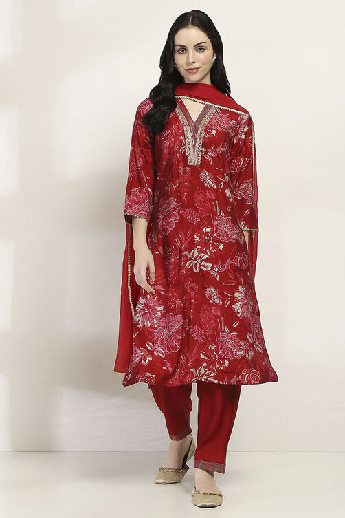 Step into summer with effortless grace in our exquisite red printed straight suit set. Crafted from a soft, breathable viscose blend, this coordinated ensemble - featuring a floral kurta, solid pants, and a tasseled dupatta - is the perfect choice for sunny days and relaxed yet refined style.